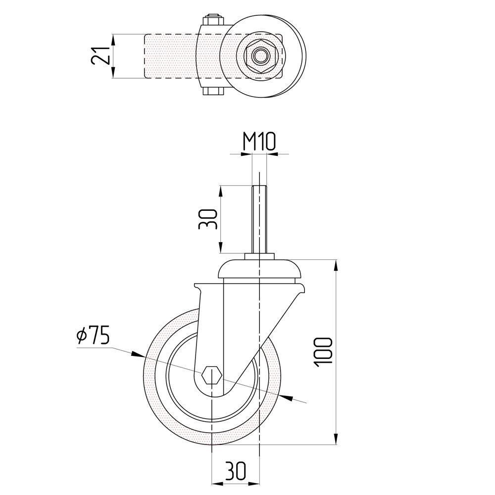 Колесо на штыре М10*30 75мм ПВХ