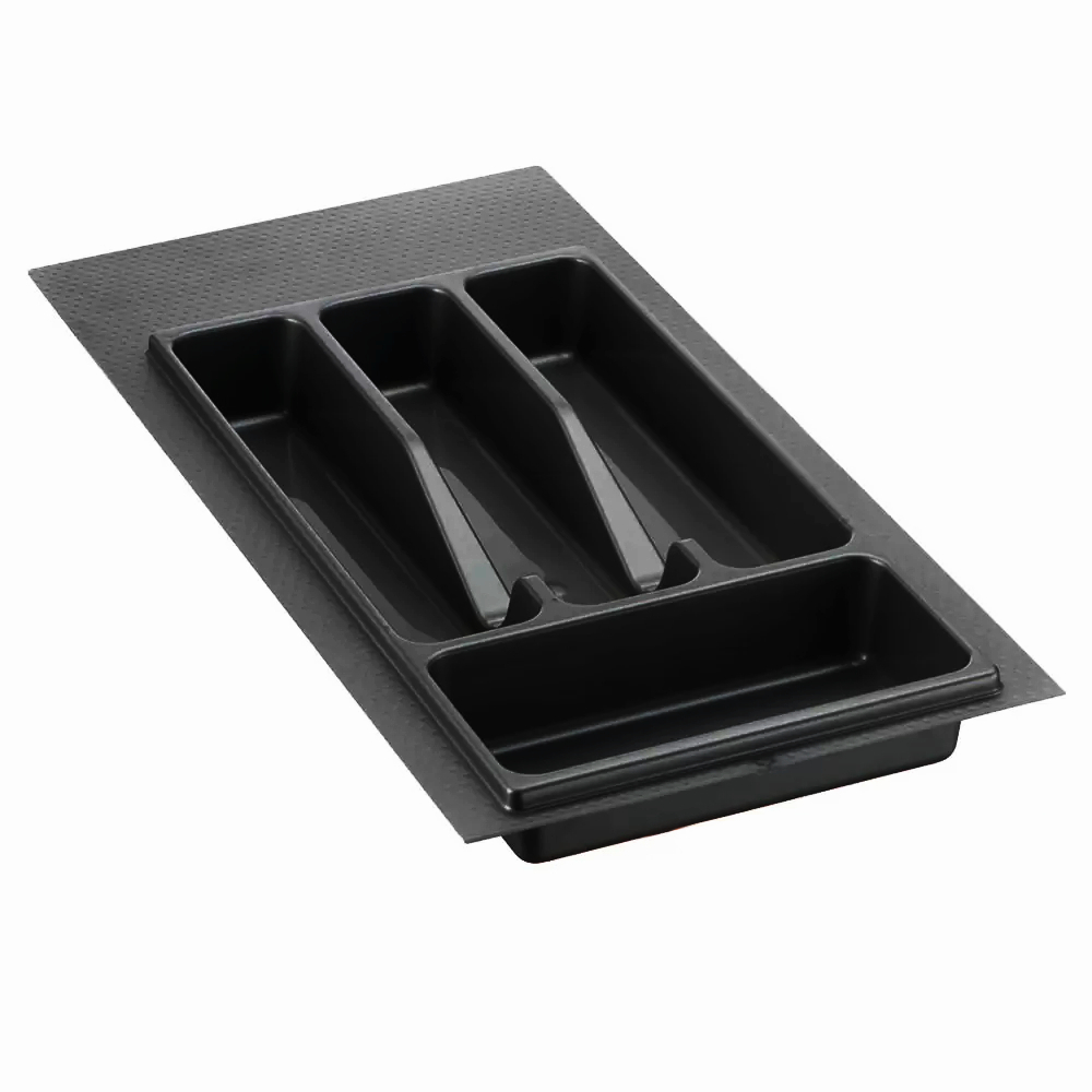 Лоток размером 290*490*42мм предназначен для хранения столовых приборов в выдвижных ящиках с шириной базы от 300 до 350 мм. Пластмассовые бортики лотка, при необходимости, отрезаются под конкретный размер ящика. Лоток снабжен четырьмя ячейками, ширина трех из них составляет по 60 мм, верхняя ячейка - шириной 90 мм. Помимо кухонных тумб, лоток может использоваться в ящике письменного стола в качестве органайзера канцелярских принадлежностей.