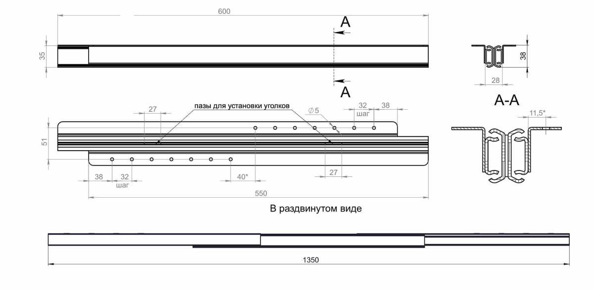 Механизм многоколенный Т2-600 длиной в сложенном виде 600 мм крепится непосредственно к столешнице, царга для крепления не требуется, обеспечивая раздвижение до 1350 мм, подходит для вставки шириной до 800 мм.