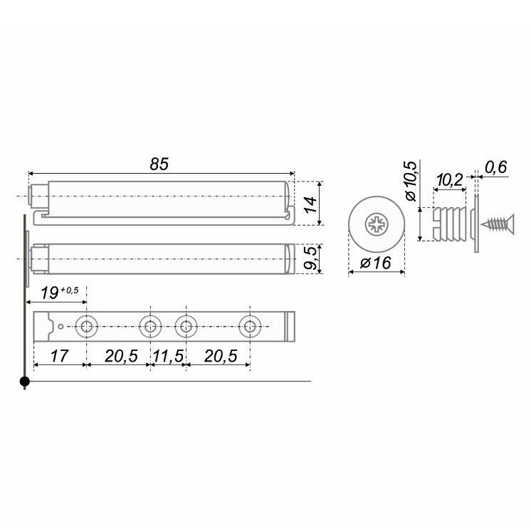 Толкатель – незаменимый компаньон мебели без ручек, он предназначен для распашных фасадов на петлях с пружиной. Данная модель снабжена магнитным наконечником и рассчитана на установку в паре с пружиной обратного хода или с петлёй без пружины. Механизм способен выталкивать на 37 мм даже тяжелые и крупные фасады. Обладает регулировкой расстояния зазора между наконечником толкателя и фасадом в закрытом положении +5 мм. Этот толкатель комплектуется ответной стальной планкой, крепежной футоркой с саморезом.