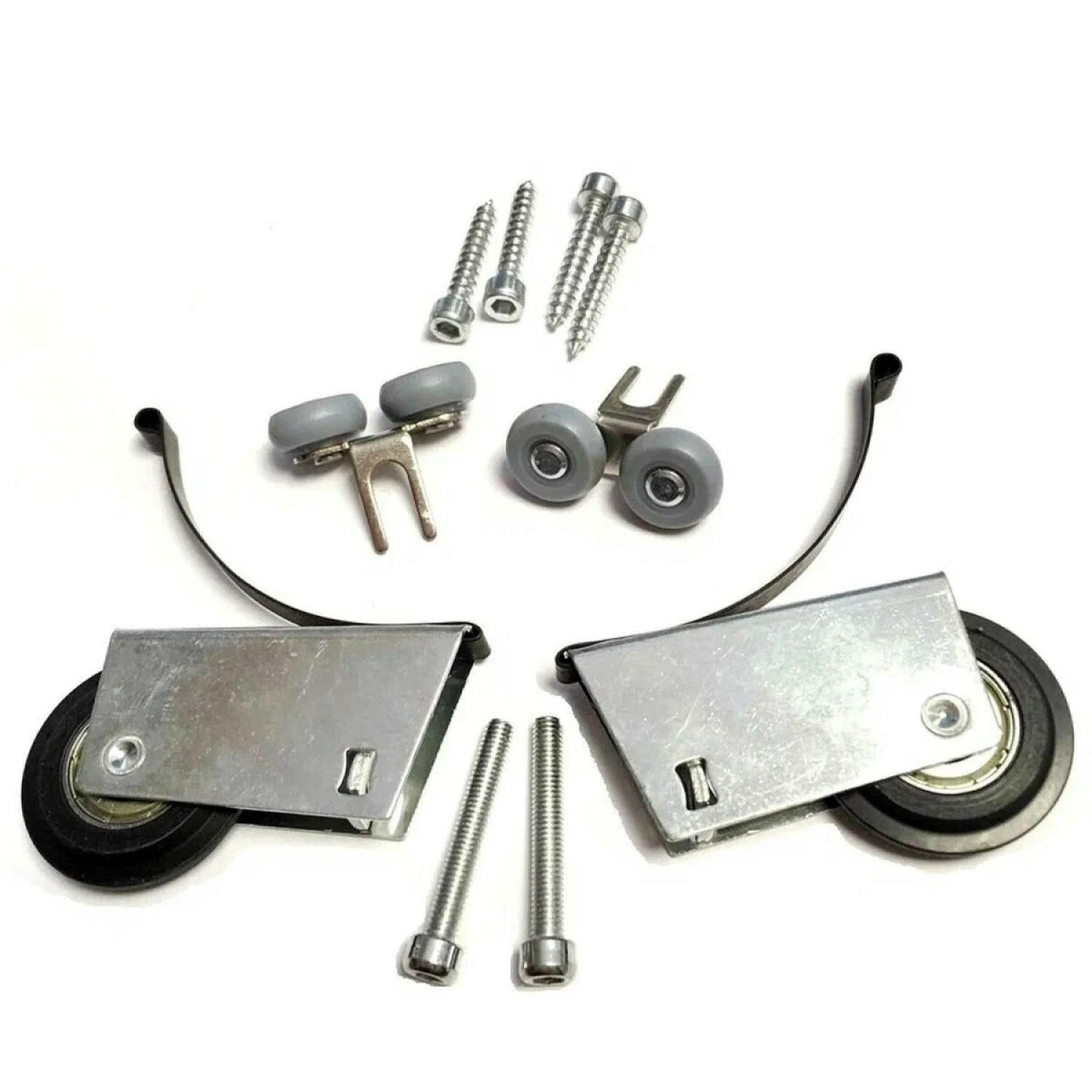 Устройство предназначено для плавного бесшумного передвижения дверей-купе вдоль направляющей. Комплект роликов соответствует открытому профилю 37,5 мм. Основная нагрузка приходится на нижние ролики, оснащенные шарикоподшипником. Регулировочные винты, предназначенные для нижних роликов, заведуют выравниванием дверей относительно боковин и соседних дверей шкафа. Верхние ролики обеспечивают фиксацию дверей в вертикальном положении. Комплект рассчитан на вес двери до 55 кг.