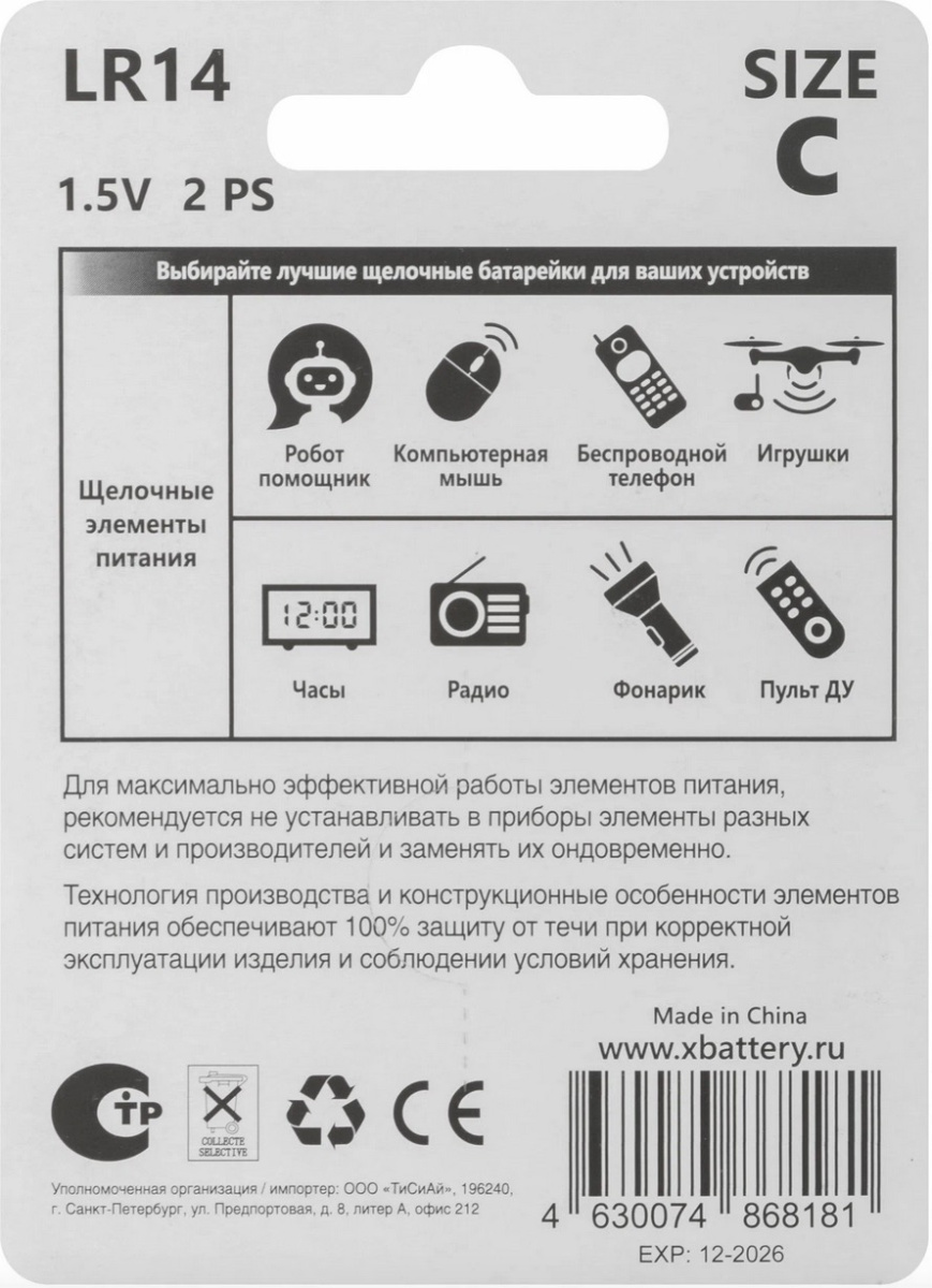 —Батарейка щелочная, 1,5 В, тип С, LR14-2BPC, 2 шт