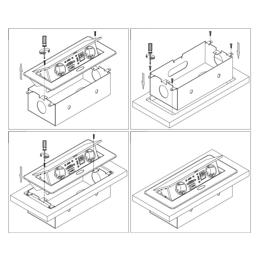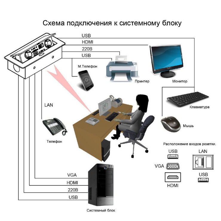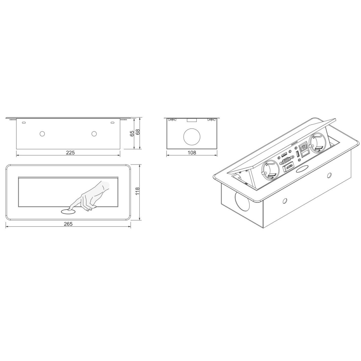 Горизонтальный выдвижной блок розеток на 2 евро-гнезда и 2 USB используется для одновременного подключения двух единиц оснащения и подзарядки пары мобильных устройств. Удлинитель монтируется в столешницу и выдвигается при легком нажатии на кнопку. Устройство универсально для квартир, офисов и конференций. Для монтажа необходимо врезное отверстие размером 225*108 мм.